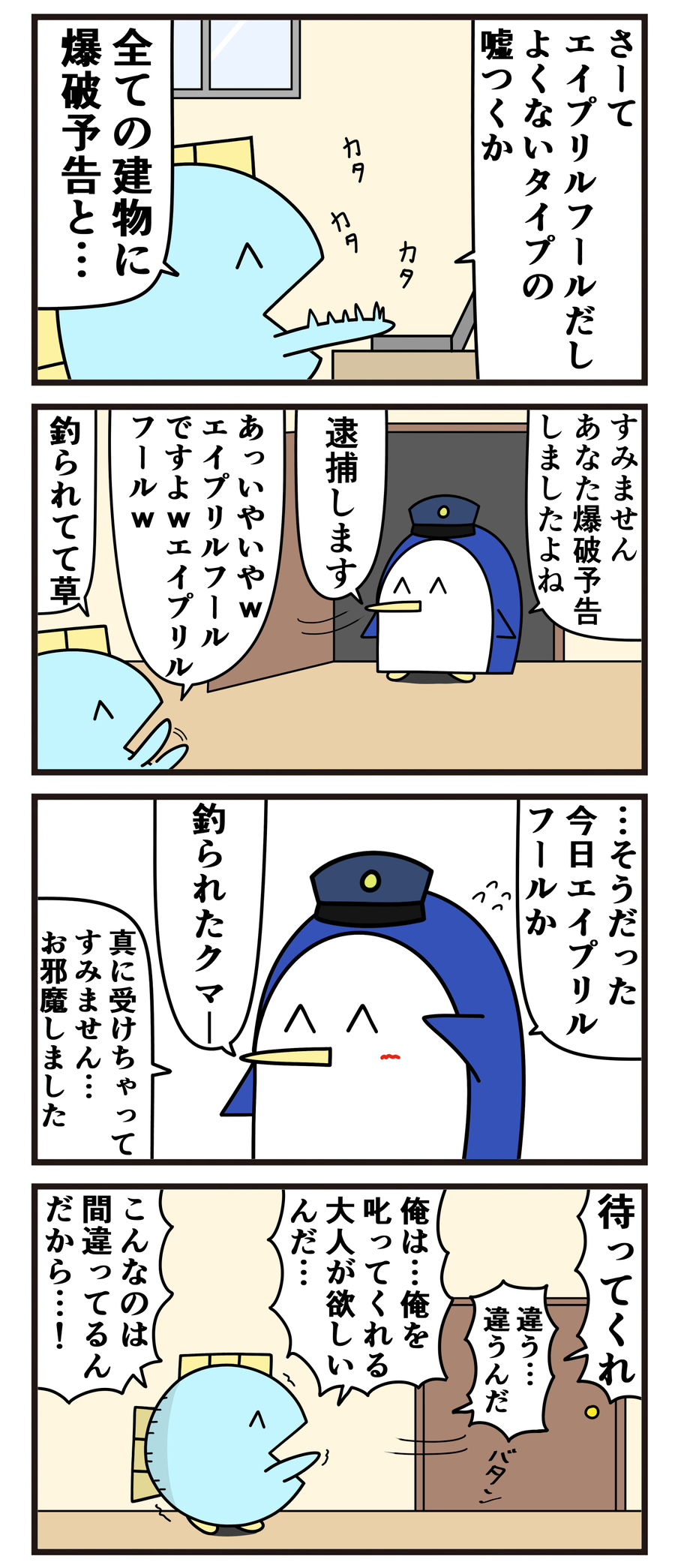 魚の4コマ「エイプリルフールによくないタイプの嘘つく人とそれを許しちゃう警察」